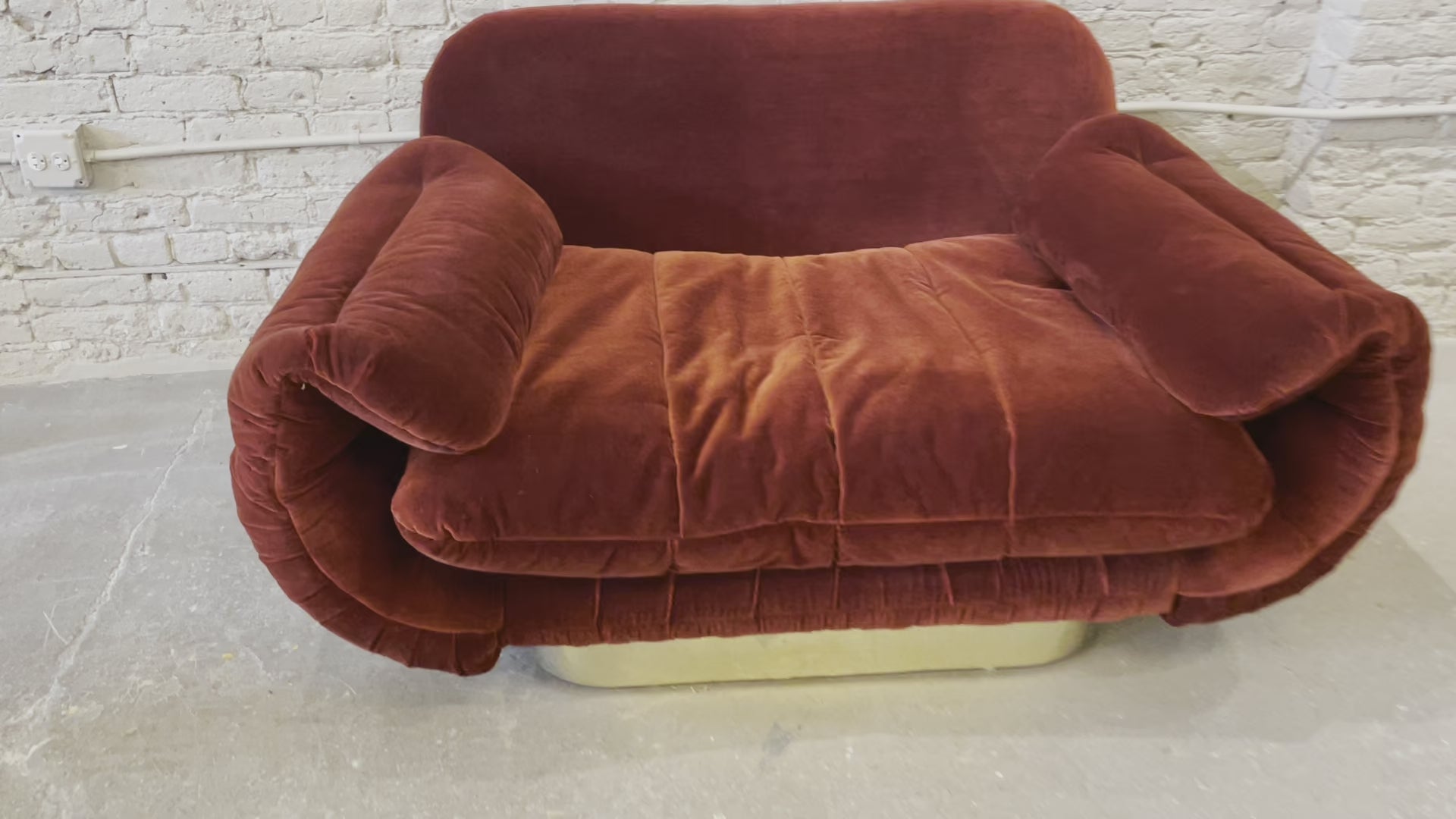 1970s Red Loveseat with Curved Arms & Brass Plinth Base
