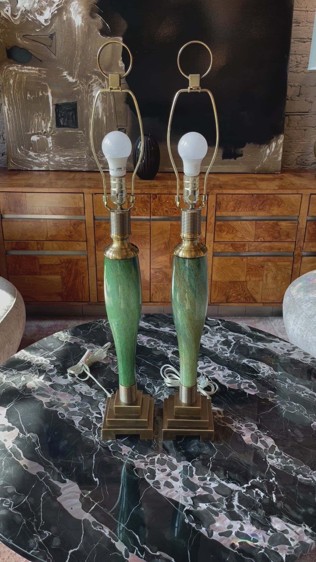 Oh my these lamps!! The architectural brass base with coiled accents look modern Egyptian to me. Please also note the circular finials (have never seen these before). The green glaze mimics stone - these lamps go with any style and any color palette. Absolutely beautiful. less