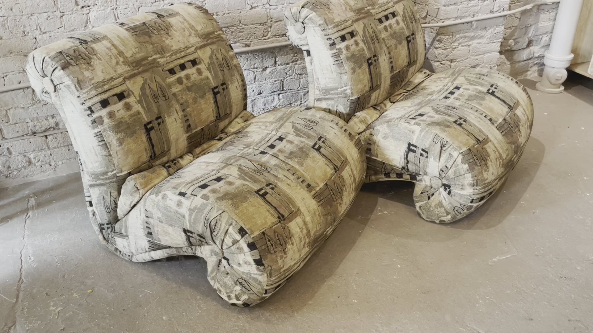 What fun lines. The arc, the button tufting, the extra wide seat…so love these chairs. In original upholstery (no tears or stains). I could see this casually in a game room or in a beautiful fabric for formal seating.