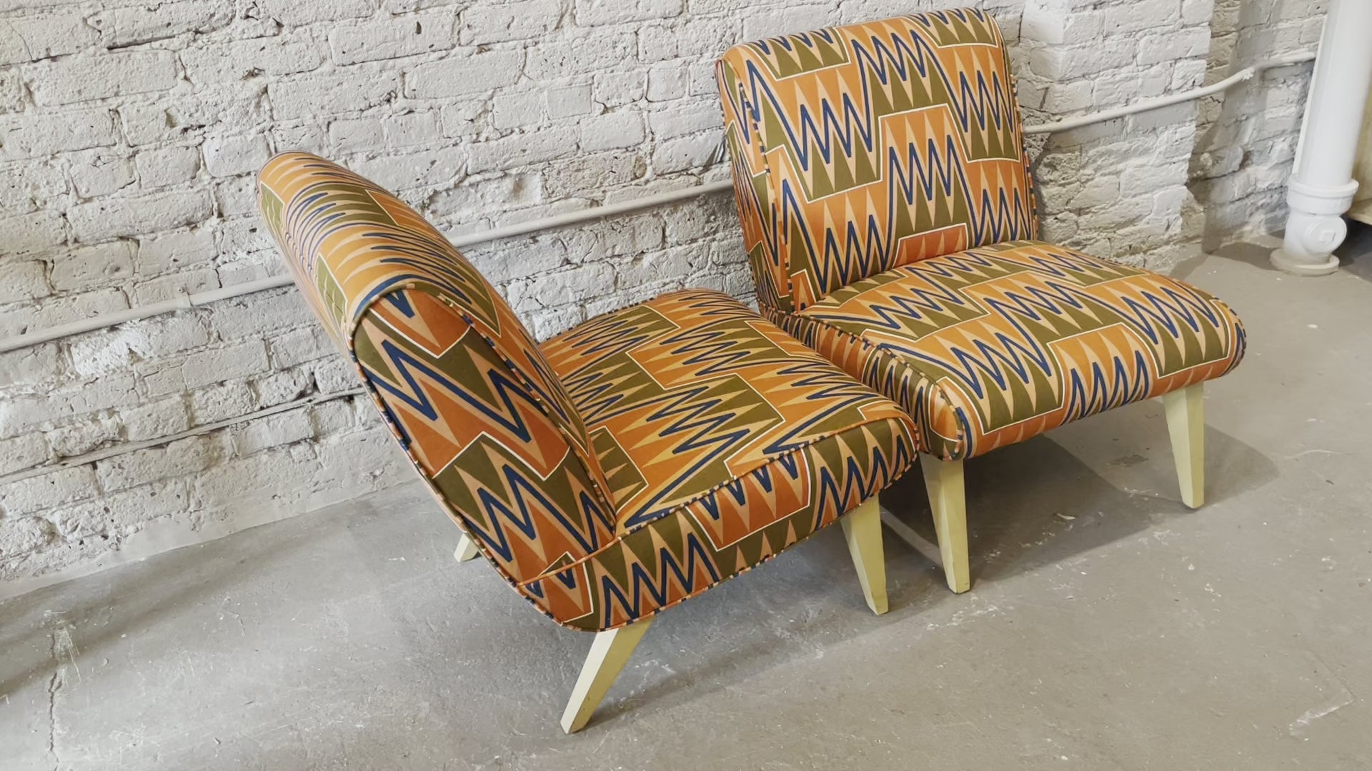 What cool lines! The simplicity and comfort allow for these chairs to be used in any room. They were recently reupholstered in this mid century style fabric.