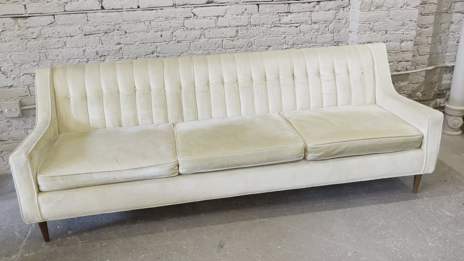 Beautiful lines and very solid wood construction. New upholstery recommended but the cushions and structure is perfectly intact. Matching side chairs and ottoman available as well - please see my other listings.