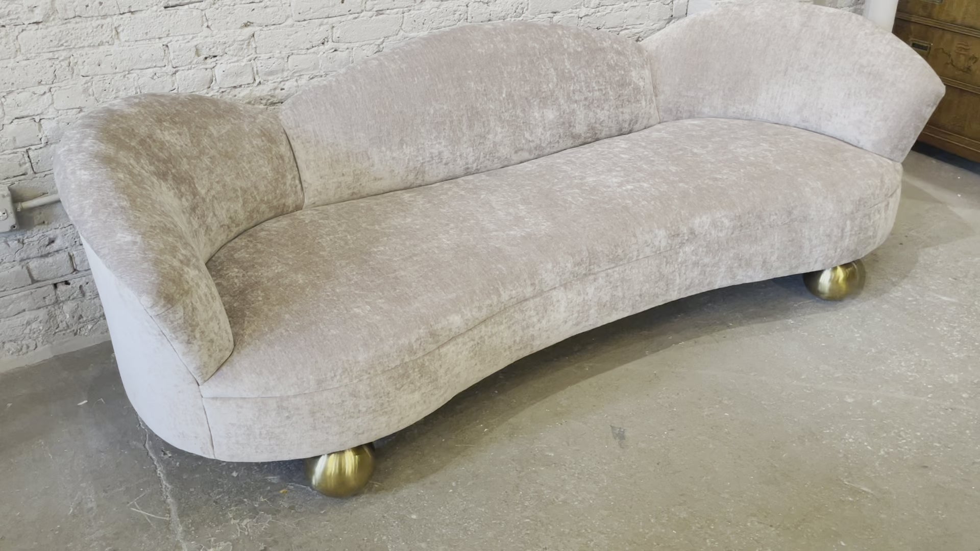 I adore this sofa - from the 60s we removed the original yellow fabric, streamlined the sewing in this two toned velvet and added custom brass feet. Absolutely darling with good scale (95”W 36”D 31”H)
