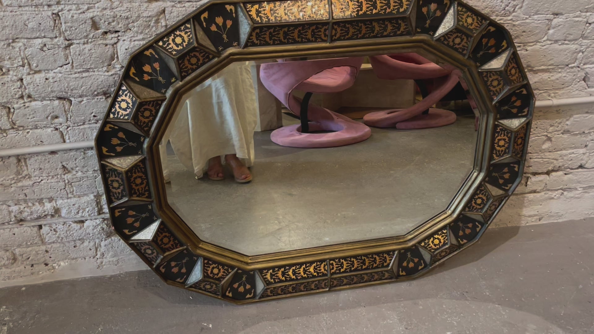 This stunning 12 sided eglomise style mirror from Baker Furniture has a geometric and dimensional frame. Gold trim, black panels, and gold details give boldness to the opulent design. The back has a label plaque marked “Baker / Furniture” and another reading “SOUTH CONE / COLLECTION”. Frame in good vintage condition, some cracking in wood but sturdy and stable. Glass/mirror in very good condition with no chips or breaks.
