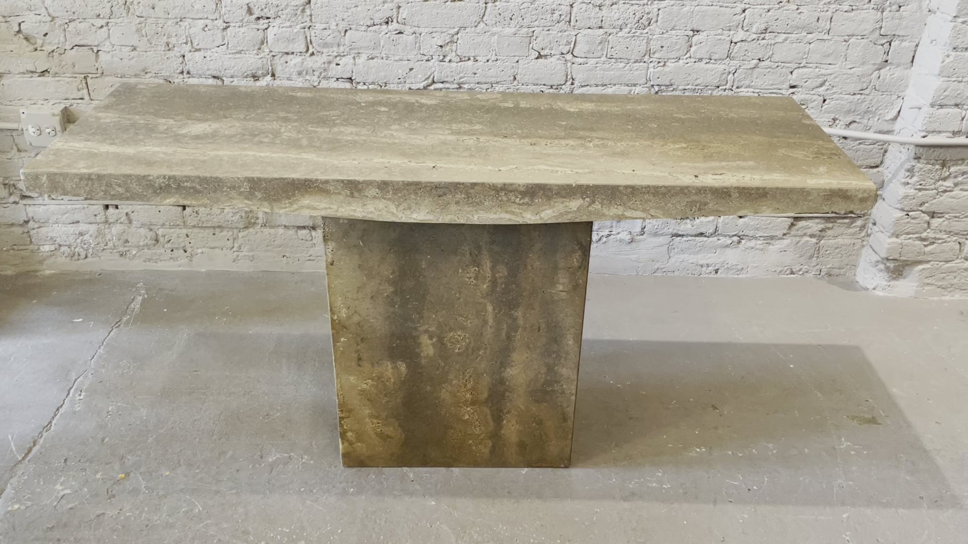 1980s Italian Walnut Travertine Postmodern Console Table With Bowed Edge- Honed