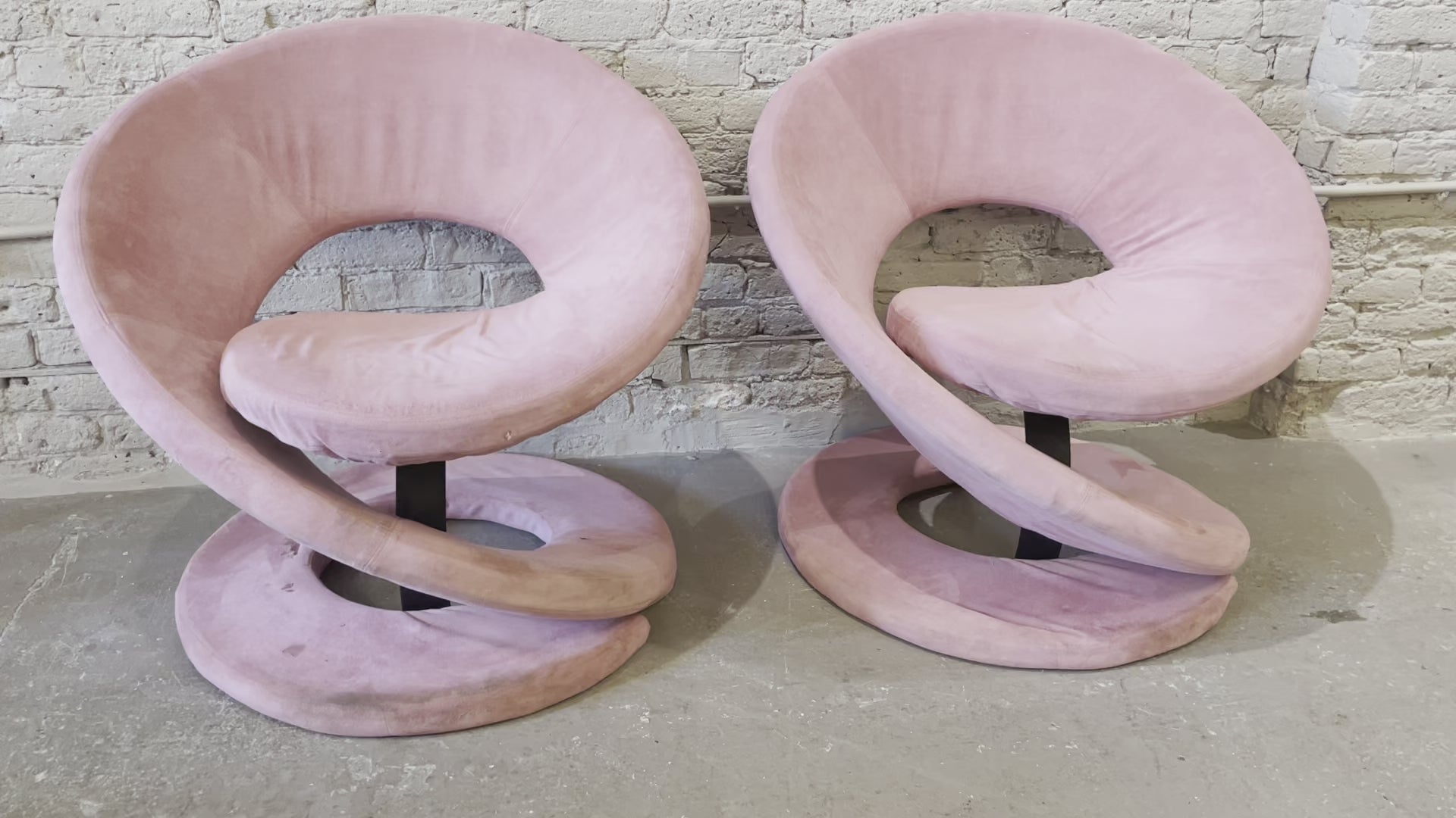 Original pink microsuede fabric (should be reupholstered). Structure is solid. The chairs are unmarked.