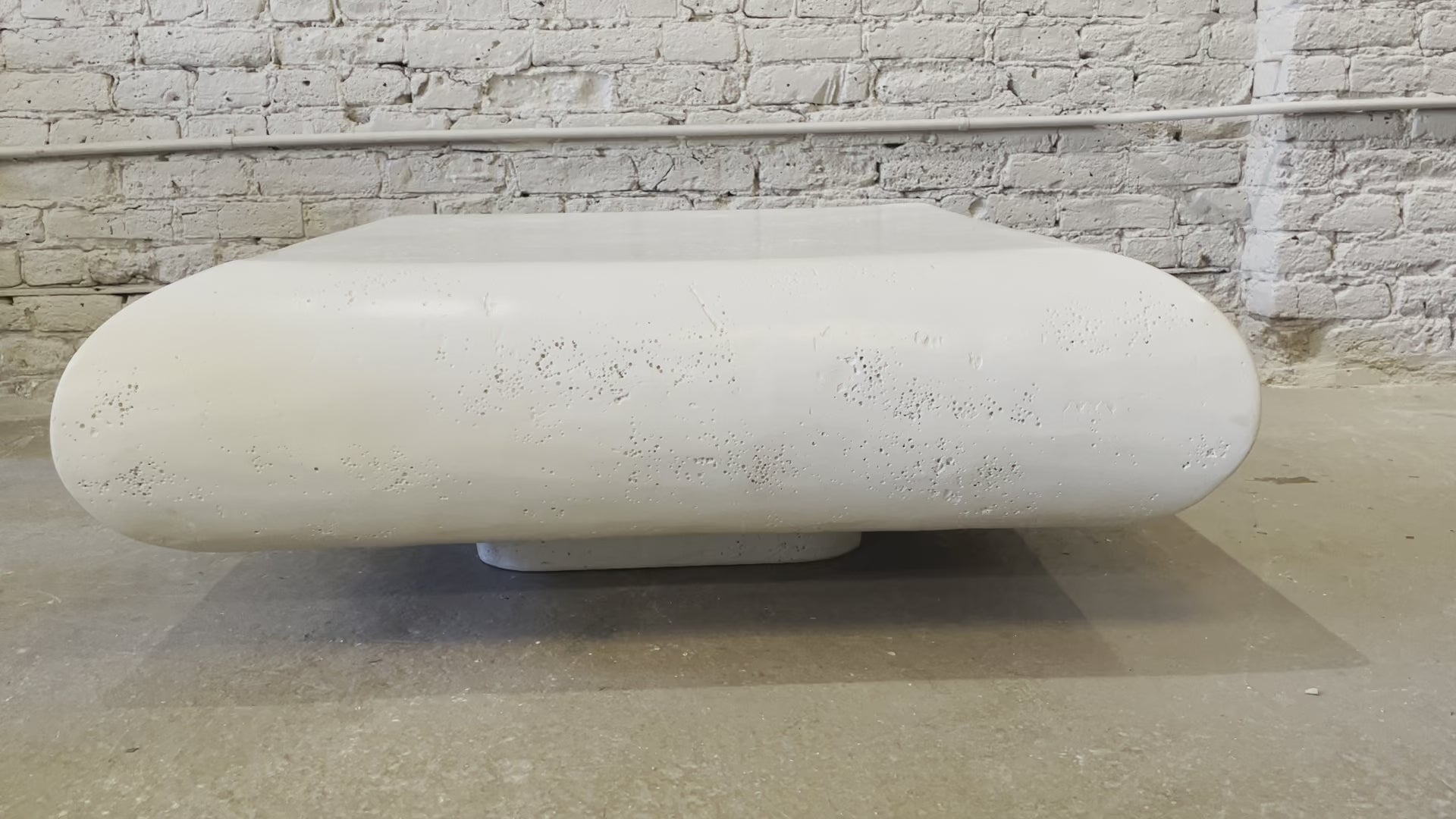 Super cool coffee table! Very modern minimal with a space age vibe. Heavy but not too heavy - 2 people can easily move it. It’s also very kid friendly due to the rounded organic edges. Love this!