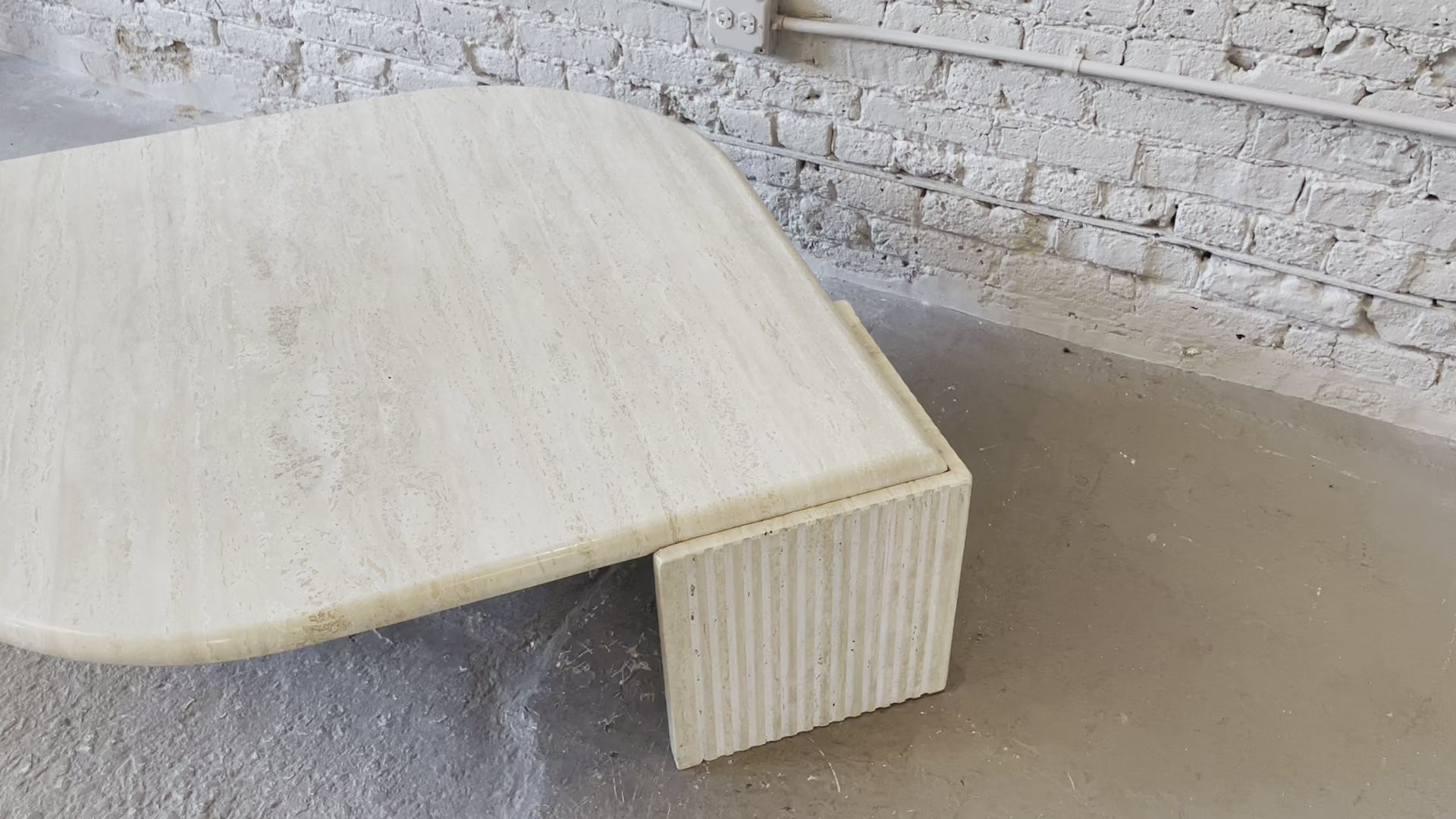 Beautiful and simple vintage travertine coffee table that floats on two triangle bases. Excellent condition for being 40 years old!