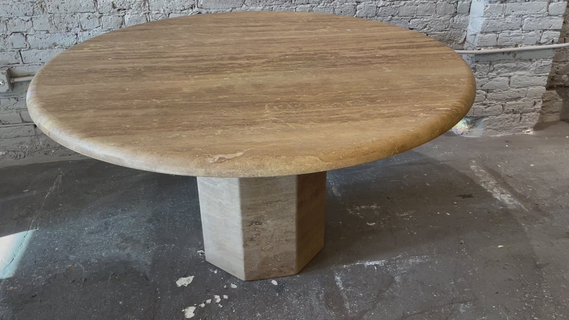 Oh I love having the old lacquer removed to reveal a beautiful matte honed texture. This technique modernizes vintage tables and makes them look brand new. This table is walnut travertine (more brown than typical ivory travertine).